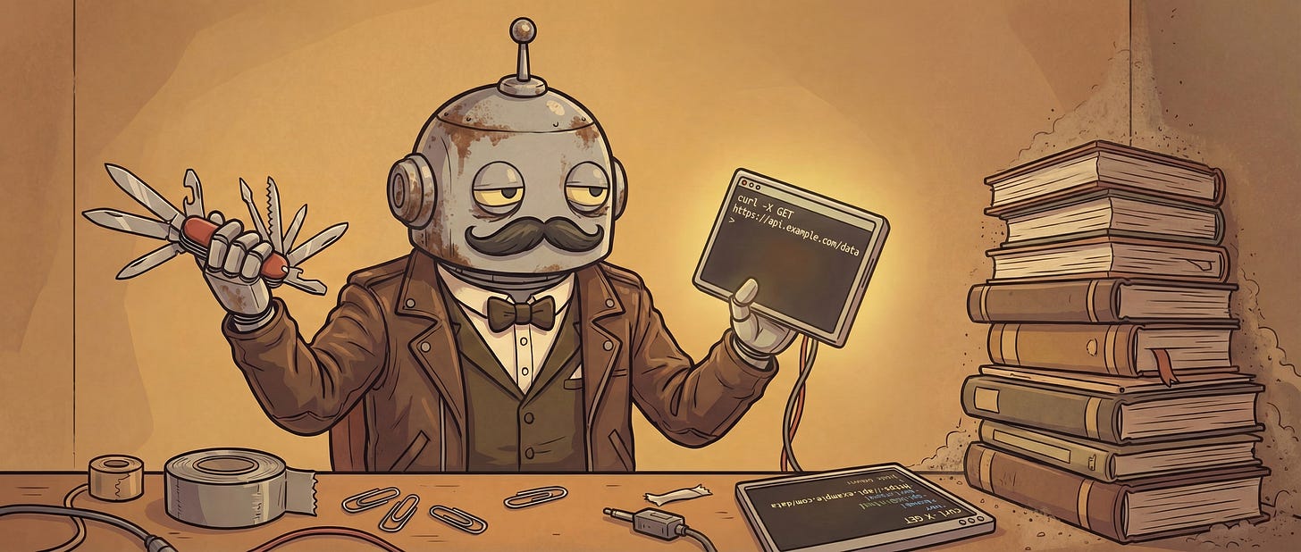 Jean reminds me of my favorite childhood character MacGyver, adventurer that solves almost every problem with a Swiss Army knife. He can still use any sophisticated tools and use his own skills but it can effectively work with just good old curl, requiring only an API token to do his job. If he faces any issue - and there are plenty of badly documented APIs - he writes it down and next time needs no assistance.
